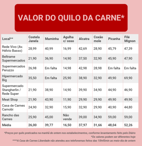 A pesquisa foi realizada na manhã de segunda, presencialmente, das 9h às 10h30min, e por telefone das 10h45min ao meio-dia. Os preços praticados nos estabelecimentos na terça-feira podem ser diferentes.