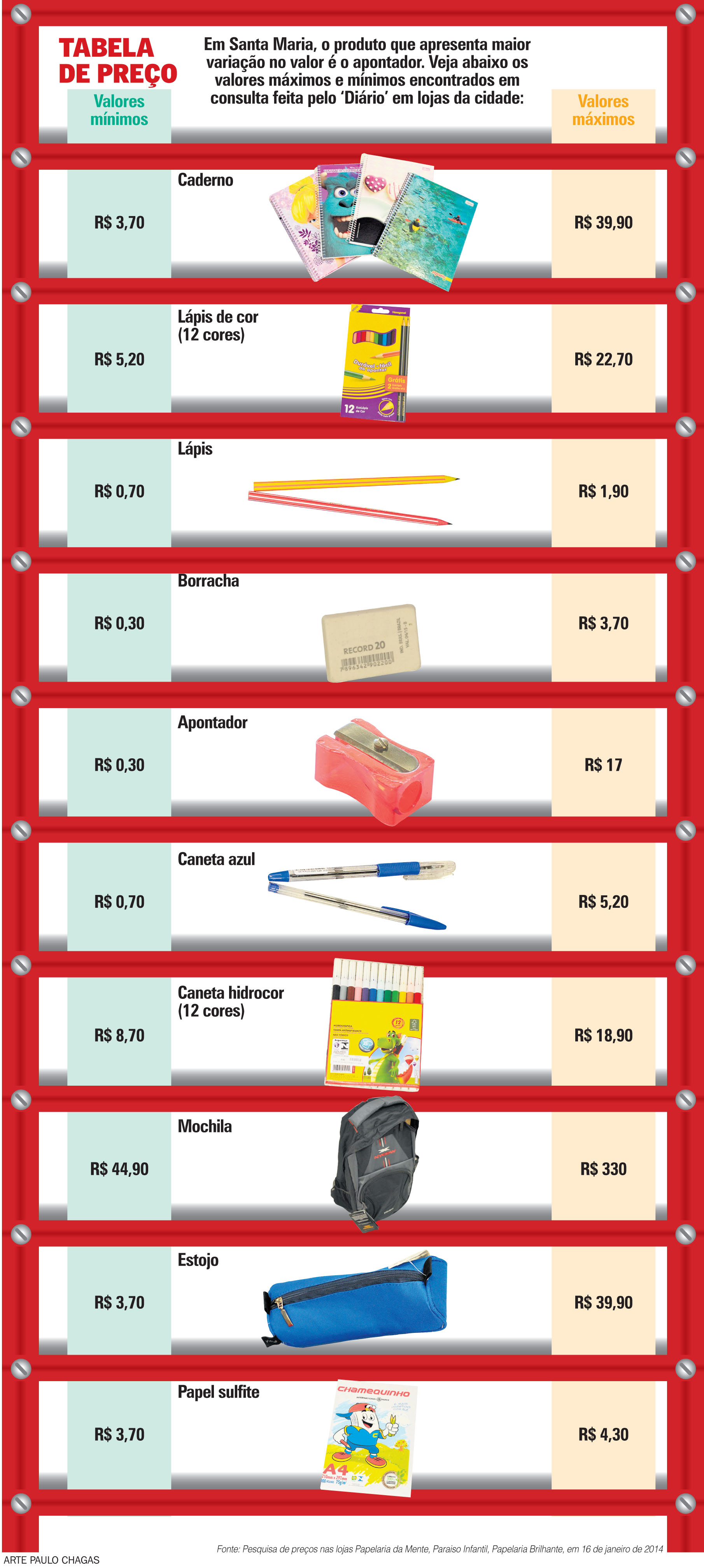 Além disso, os preços variam muito, aumentando as dúvidas quanto à escolha da marca. Um apontador, por exemplo, pode custar de R$ 0,30 a R$ 17 - uma variação de 5.000%. Já os preços de cadernos, borrachas e estojos variam em média 1.000%, ou seja, o mais caro custa 10 vezes mais do que o mais barato.