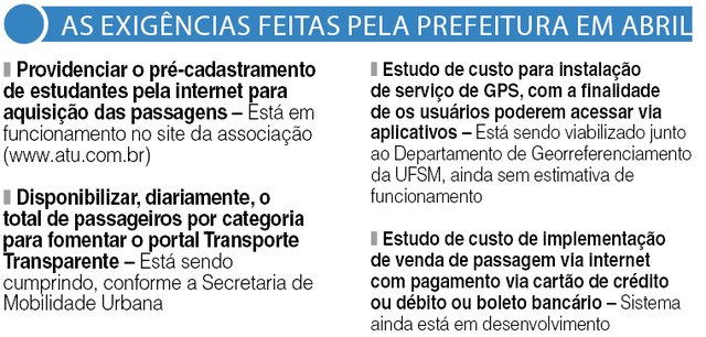 Dentre os pontos exigidos pela prefeitura para conceder o último aumento, em abril, estão dois que ainda não foram cumpridos. O primeiro é a apresentação do custo para implementação de venda de passagem pela internet com possibilidade de pagamento através de boleto ou cartão, o qual está em desenvolvimento, segundo a ATU. Já o segundo é um levantamento de quanto custaria para instalar GPS nos ônibus afim de oferecer informações de rota e horários via aplicativos aos usuários.