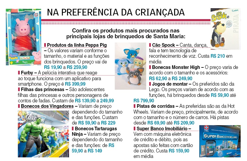 Entre os brinquedos mais pedidos pela criançada, está a pelúcia interativa Furby, que custa R$ 399,99. Mas há presentes de R$ 899,90, como um helicóptero com câmera acoplada e controle por rádio, ou até de maior valor.
