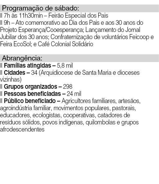 Três décadas de incentivo ao cooperativismo e à agricultura familiar serão comemorados pelo Projeto Esperança/Cooesperança neste sábado, em Santa Maria. A iniciativa, idealizada pelo bispo Dom Ivo Lorscheiter, completa 30 anos de fundação no dia 15 de agosto, contudo as festividades ocorrem a partir das 9h no Feirão Colonial do Centro de Referência de Economia Solidária Dom Ivo Lorscheiter, no bairro Medianeira.