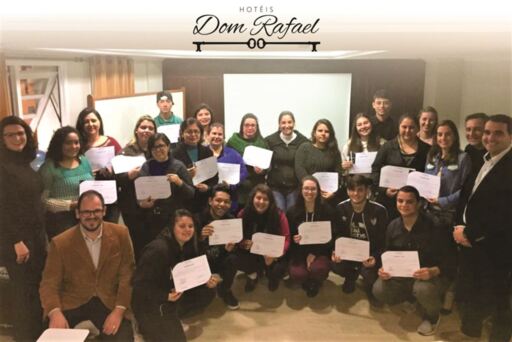 No meio empresarial, são comuns as queixas de que falta qualificação de mão de obra. Porém, em vez de apenas se queixar, que tal ajudar? Foi o que fez a rede de Hotéis Dom Rafael, de Santa Maria, que está com uma excelente iniciativa. Recentemente, a empresa concluiu o curso gratuito para pessoas que queiram trabalhar em recepção de hotel. Os formados aparecem na foto acima e poderão participar de seleções de emprego tanto na rede Dom Rafael quanto em outros hotéis da cidade.