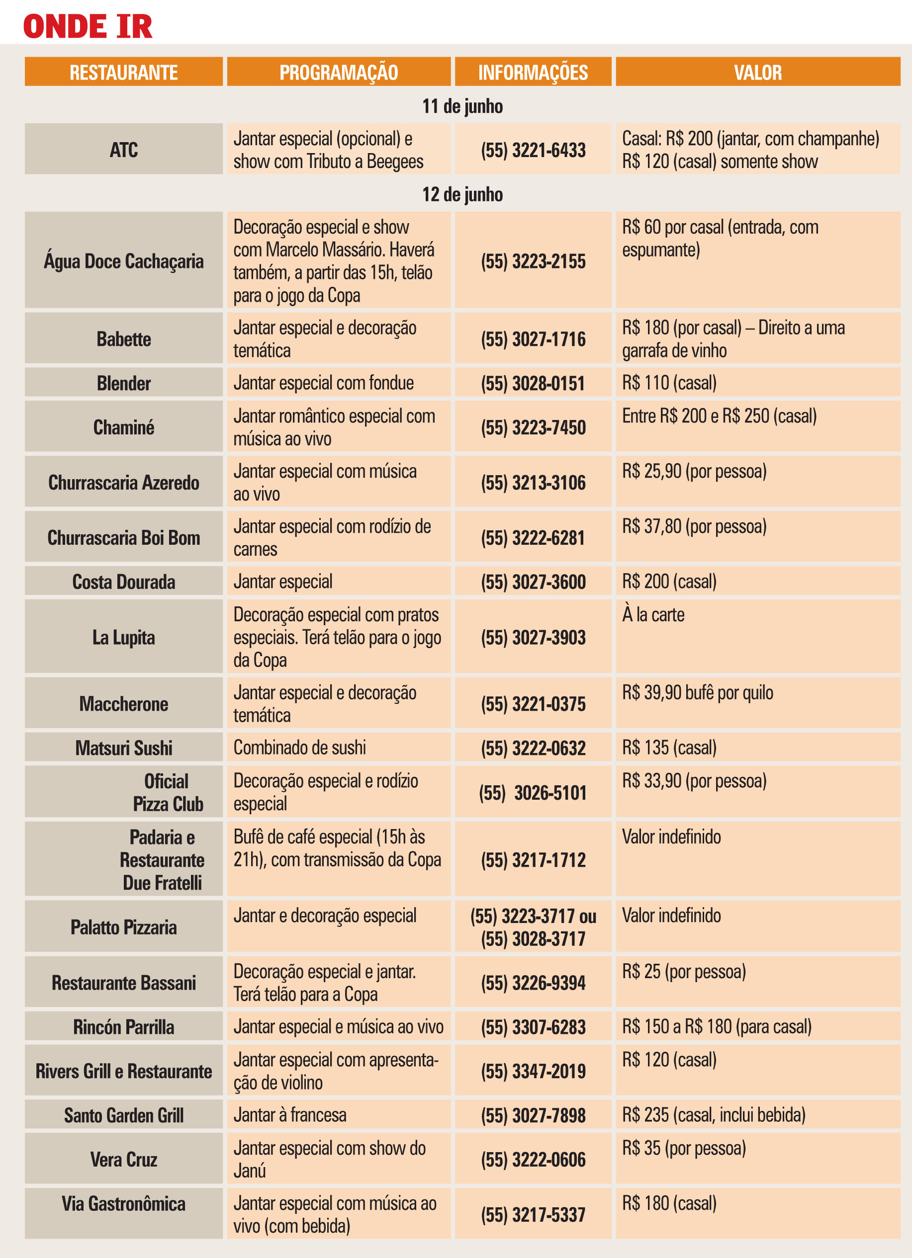 O Dia dos Namorados deste ano, que se comemora no dia 12 de junho, vai ter um ingrediente especial. Além da noite dos apaixonados, a próxima quinta-feira marcará a abertura da Copa do Mundo no Brasil, que será celebrada com a estreia da seleção brasileira na competição - o jogo contra a Croácia está marcado para as 17h no Estádio Maracanã, no Rio de Janeiro. E os restaurantes de Santa Maria já estão trabalhando na organização destes eventos especiais que devem reunir muita gente.