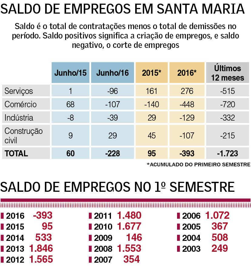 Desde 2003, quando a geração de empregos começou a ser medida na cidade, Santa Maria não tinha tido um primeiro semestre tão ruim. Pela primeira vez, fechou com mais demissões do que contratações, resultando em inédito saldo negativo e o fechamento de 393 empregos.