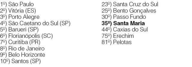 Este ano, aqui no Estado, Santa Maria ficou atrás somente de Porto Alegre, Santa Cruz do Sul, Bento Gonçalves e Passo Fundo. Todas também tiveram grande melhora no ranking – Santa Cruz pulou de 84º para 23º lugar, enquanto Bento subiu de 85º para 25º. Por sinal, das gaúchas, só Caxias do Sul caiu no ranking, possivelmente pela crise na indústria, e foi ultrapassada por Santa Maria. Erechim e Pelotas, que não figuravam na lista, entraram entre as 100 primeiras este ano.