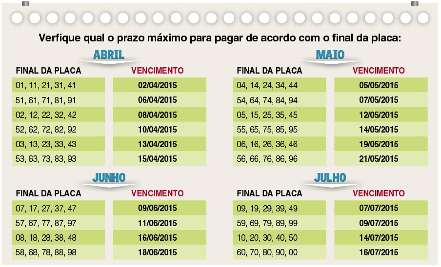 Proprietários que não optarem pela antecipação, terão seus vencimentos entre abril e julho, conforme a placa do veículo: