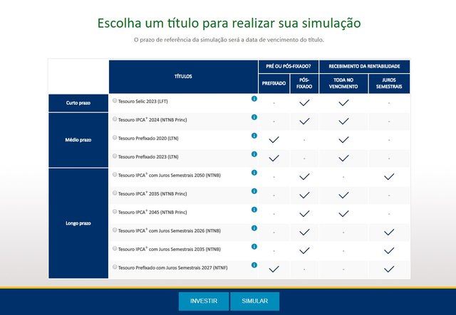 Se quiser somente calcular a rentabilidade, o investidor deve clicar em "simular", na tela inicial. Depois, precisa escolher um título -há indicações sobre o prazo e informações sobre características [prefixado ou pós-fixado] e sobre a remuneração dos juros. Ao clicar em simular, é levado a uma página na qual deve indicar quanto ele quer investir hoje ou o valor que deseja resgatar no futuro. Nesse último caso, o poupador ainda precisa informar se vai aplicar o dinheiro uma única vez ou se fará aportes mensais.