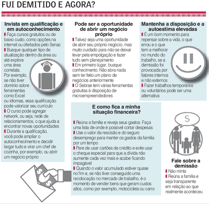 Segundo o economista Alexandre Reis, a primeira questão a ser respondida envolve identificar os motivos da demissão, se é em função da crise ou de um problema individual. Após, seguem-se passos básicos como cortar gastos e replanejar o orçamento familiar, buscar qualificação e até redefinir os rumos da carreira leia mais no quadro.