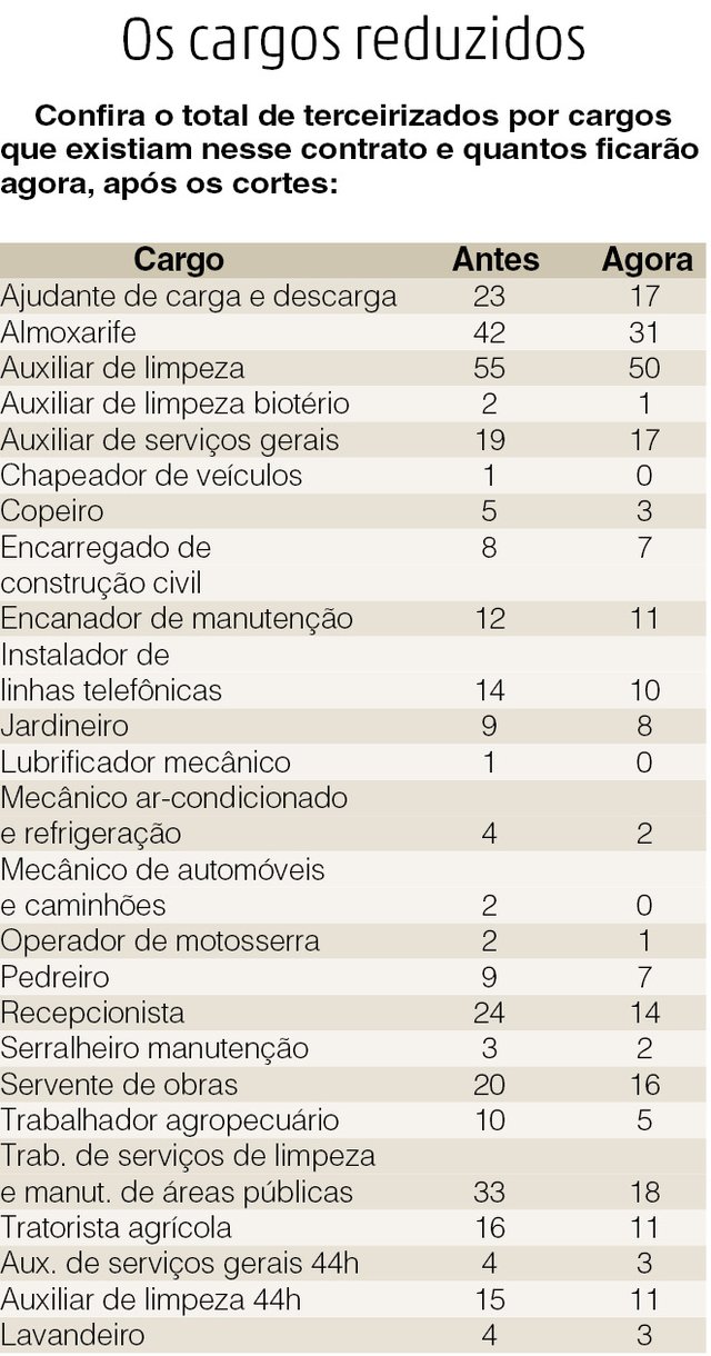 – Nesse contrato, o gasto mensal estava em R$ 1,714 milhão por mês e, com essa redução de 432 para 340 postos de trabalho, vai ficar em R$ 1,336 milhão, o que vai dar uma economia R$ 377 mil. Não tem o que fazer. Chegamos numa encruzilhada, mesmo com esse corte, vamos ter dificuldade. E isso ainda não resolve o problema. Por isso a luta permanente do reitor. Essa redução ameniza, senão daqui a pouco fecha o contrato, pois se não tem orçamento para fazer frente o contrato, não tem valor empenhado e não pode emitir notas – diz Segalla, esclarecendo que a definição das pessoas que serão demitidas fica a cargo da empresa contratada, sem escolha ou interferência da universidade.