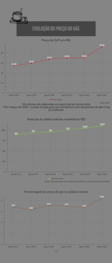 No ano de 2018, também em agosto, a parcela do gás no salário mínimo subiu para 7,06%. Depois, teve duas quedas seguidas, em 2018 (6,98%) e 2019 (6,70%), Porém, em nenhum desses momentos, retornou ao menor patamar. Em 2021, com o gás representando 8,36% do salário mínimo, é a maior porcentagem do produto em cinco anos.