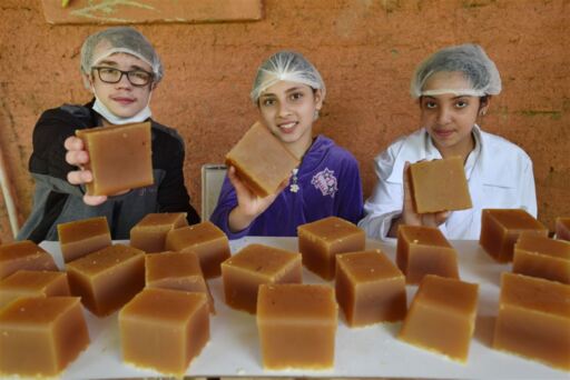 Cada aluno está inserido em um ou mais projetos, com o intuito de melhorar o ambiente que frequentam. No processo de produção de sabão, que tem por meta implantar a coleta e a reciclagem de óleo de cozinha, estão os alunos do 6º ano Guilherme Martins, 11 anos, Daiane Ferraz, 12, e Alice Beatriz Cardoso, 12.