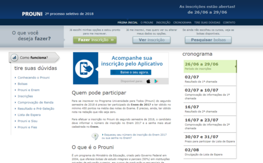 Para se candidatar, é preciso ter feito o Exame Nacional do Ensino Médio (Enem) de 2017, ter alcançado no mínimo 450 pontos e ter tido nota superior a zero na redação. Além disso, apenas alunos brasileiros sem curso superior e que tenham cursado o ensino médio completo na rede pública ou como bolsista integral na rede privada podem concorrer. Alunos que fizeram parte do ensino médio na rede pública e a outra parte na rede privada na condição de bolsista ou que sejam deficientes físicos ou professores da rede pública também podem solicitar uma bolsa.