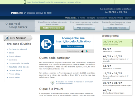 Para se candidatar, é preciso ter feito o Exame Nacional do Ensino Médio (Enem) de 2017, ter alcançado no mínimo 450 pontos e ter tido nota superior a zero na redação. Além disso, apenas alunos brasileiros sem curso superior e que tenham cursado o ensino médio completo na rede pública ou como bolsista integral na rede privada podem concorrer. Alunos que fizeram parte do ensino médio na rede pública e a outra parte na rede privada na condição de bolsista ou que sejam deficientes físicos ou professores da rede pública também podem solicitar uma bolsa.