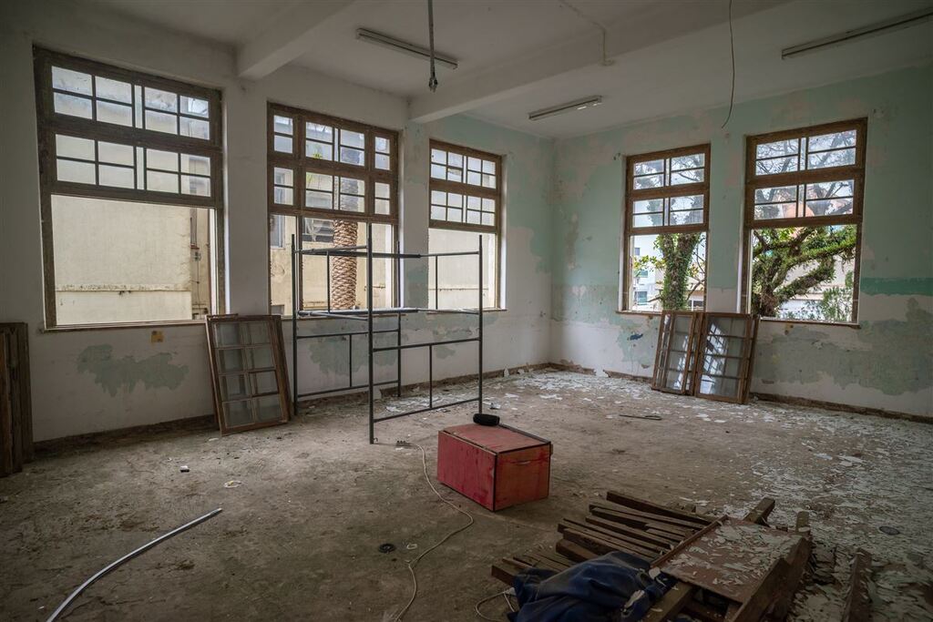 Um dos pontos de maior atenção foi a base do ginásio, onde a umidade se acumulava e comprometia as paredes. Segundo Jaeger, o reboco foi totalmente retirado até cerca de dois metros de altura e refeito. Situação semelhante ocorre agora no bloco principal, que já está recebendo nova fachada e lavagem das paredes.