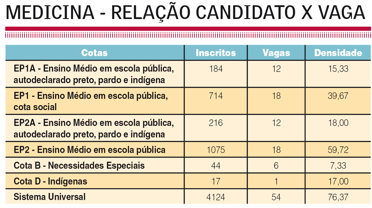 O curso mais concorrido desta edição não é surpresa: a densidade do curso de Medicina ficou em 76,37 candidatos por vaga pelo sistema universal. Foram 4.124 inscritos para as 54 vagas disponibilizadas pela cota. Ao todo, são 6.374 inscritos disputando as 121 vagas disponíveis pelo curso (somando as vagas de todas as cotas).