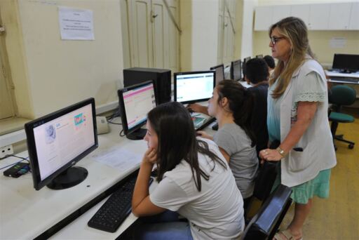 Professora Sônia Santos orienta os alunos a encontrarem matérias no site do Diário e a escreverem as cartas para o espaço do leitor