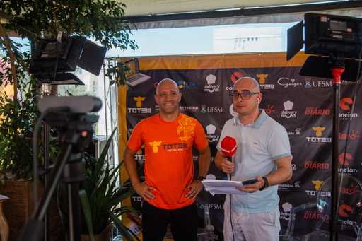 O professor e diretor do Totem Vestibulares, Jader Escobar (à esq.), fala com o apresentador Rogério Kerber durante a cobertura multiplataforma do Grupo Diário