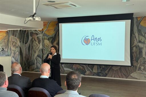 A Universidade Federal de Santa Maria (UFSM) deu início às comemorações dos 65 anos da instituição com o lançamento do selo comemorativo. A apresentação foi feita na manhã desta segunda-feira (11), em evento aberto ao público que contou com a presença do reitor Luciano Schuch, do prefeito de Santa Maria, Rodrigo Decimo, da vice-reitora, Martha Adaime, além de diretores das Unidades de Ensino, pró-reitores, secretários municipais e demais membros da comunidade. A marca será utilizada ao longo das ações e eventos programados para celebrar a trajetória da UFSM, que completa 65 anos em dezembro de 2025.