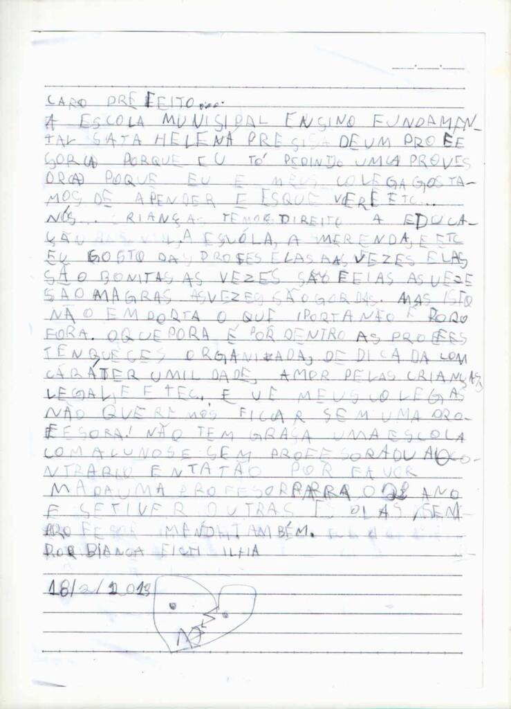 No primeiro dia de aulas, Bianca escreveu carta ao prefeito