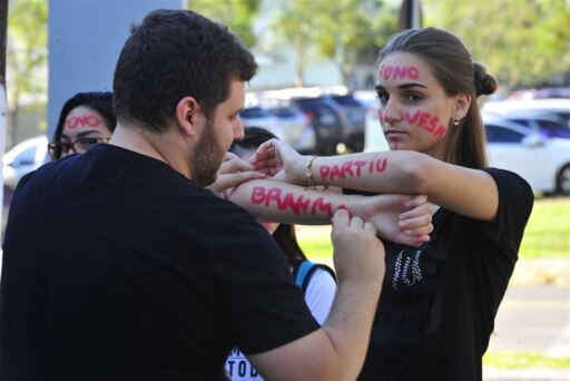 Veterano de Fonoaudiologia Ângelo Thomazi pinta a bixo Danielli Tessele na recepção do curso aos caluros