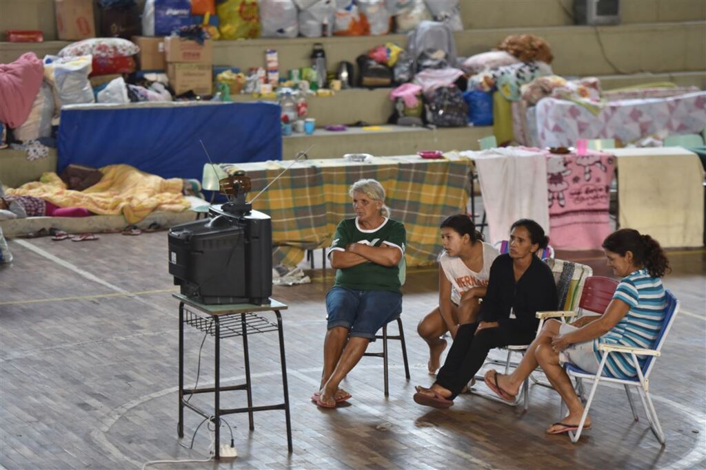 JOGOS, TELEVISÃO E REFEIÇÕESNara Rosane de Castro (à dir.), 53 anos, junto de familiares, assiste à TV instalada no centro do ginásio da Escola Oliveiro Thaddeo para ajudar a passar o tempo. Até ontem, 45 famílias estavam alojadas no local, onde há regras para a boa convivência entre as pessoas