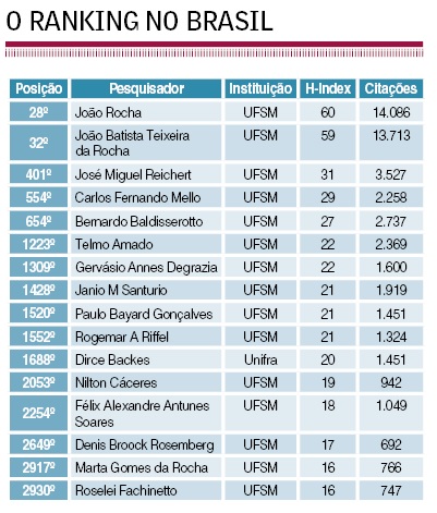 O professor João Batista Teixeira da Rocha, 51 anos, do Departamento de Bioquímica e Biologia Molecular da UFSM, aparece no ranking como o 28º com mais citações no Brasil. Como ele tem duas contas no Google, aparece duas vezes na lista, também como João Rocha. Ele está à frente até do ex-ministro Luiz Carlos Bresser Pereira, da Fundação Getúlio Vargas.