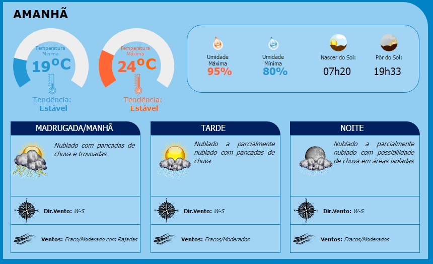 A previsão para a sexta-feira é de que o tempo esteja nublado, com pancadas de chuva no decorrer do dia. A temperatura mínima deve marcar 19ºC e as máximas não devem passar dos 24ºC. O dia deve ser, novamente, bem úmido.