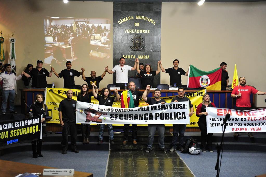 Representantes de várias categorias de servidores estaduais, principalmente das áreas de segurança e educação, chegaram à Câmara de Vereadores de Santa Maria pouco antes das 15h desta terça-feira. O grupo com mais de 100 pessoas ocupou a mesa da presidência e as mesas dos vereadores. A sessão foi adiada até a saída dos manifestantes, por volta das 16h30min, quando o grupo saiu do plenário e foi até o Calçadão distribuir panfletos.