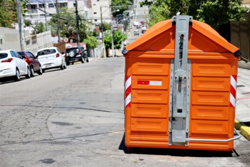 O contêiner cinza é para lixo comum, o laranja é para resíduos secos