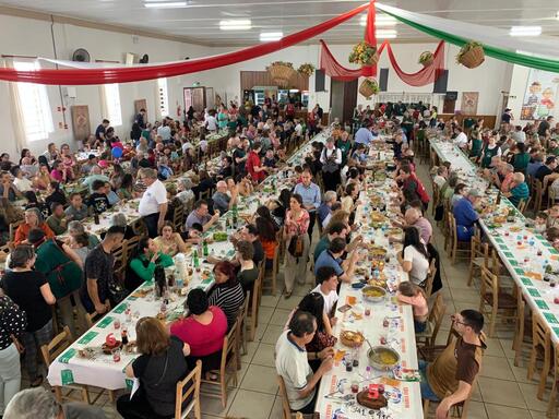 Na sequência, ao meio dia, foi servido um almoço italiano com sopa de agnolini, risoto, galeto, churrasco, pão e salada. Pela tarde, o destaque foi para o desfile típico com o tema “Vale Vêneto: 145 anos de história construída por famílias de fé, trabalho e religiosidade”.