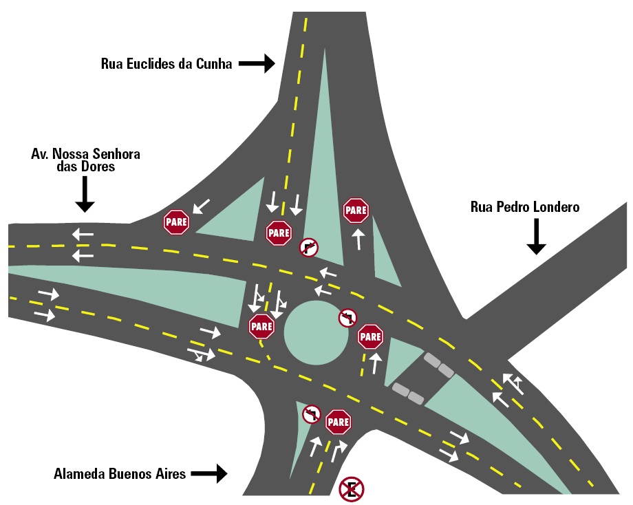 - Quem anda pela Avenida Dores, no sentido Centro-bairro, não poderá mais dobrar à esquerda em direção a Rua Euclides da Cunha. Esse movimento deverá ser feito acessando a rótula da Rua Oswaldo Cruz