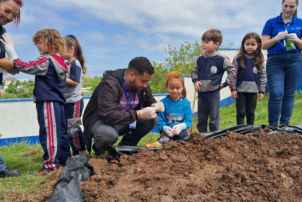 As crianças das duas turmas de pré-escola da Escola Municipal de Educação Infantil (EMEI) Gianna Grassi Didonet, no Bairro Nova Santa Marta, em Santa Maria, trocaram a sala de aula pelo pátio da escola na manhã desta quinta-feira (2). Os alunos participaram do plantio de uma horta solidária e de 20 mudas de árvores de sombra e frutíferas, em ação promovida em parceria com o grupo de voluntariado da Corsan.