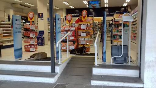 Uma foto publicada no Facebook, no início desta semana, chamou atenção dos santa-marienses pela cena inusitada. Na imagem, dois cães de rua aparecem deitados em tapetes, na entrada de uma das farmácias Panvel, no Calçadão de Santa Maria. O local serviu como abrigo do frio e da chuva que atingiu a cidade nos últimos dias. De acordo com a gerente da unidade, Leticia Jaques, os dois cachorros chegaram à farmácia espontaneamente e escolheram o lugar onde iam passar o dia.