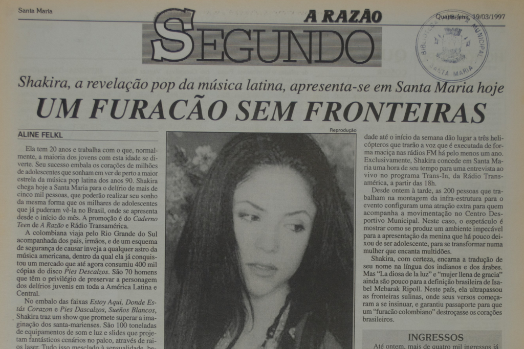 “Shakira, cheia de graça”. Foi assim que A Razão, o principal jornal da cidade na época, noticiou a proximidade do show. Em reportagem publicada no dia 17 de março, a jornalista Aline Felkl falou sobre a carreira da artista. “Aos 20, passou a embalar os sonhos de jovens de toda a América”, dizia o texto. Até o dia do show, eram 400 mil cópias do disco Pies Descalzos. Fãs entrevistados falavam sobre a expectativa de assistir a “cantora preferida”. Sucesso absoluto da revelação pop da música latina naquela época.