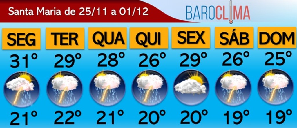 Ainda conforme a BaroClima, o próximo fim de semana promete ser de instabilidade, com uma nova rodada de pancadas de chuva, trovoadas e máximas que não devem passar dos 26°C.