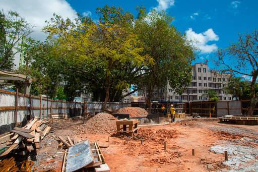Neste local, a equipe da Construtora Jobim, responsável pela obra, realiza a escavação e a instalação de pedras para o reforço de subleito (terreno que oferece sustentação para as camadas do pavimento). Na sequência, será feita a preparação da base para receber o concreto do novo piso. Além disso, no segundo quadrante, já foi concluída a concretagem dos bancos.