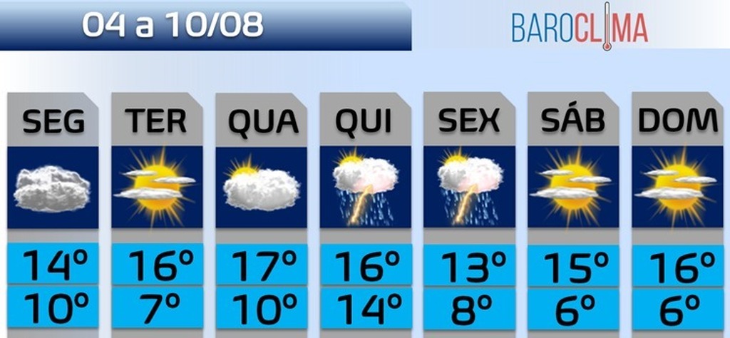 Já a partir de quinta-feira (7), destaque para uma frente fria que vai avançar na região. Pode haver pancadas de chuva e temporais isolados. Com relação as temperaturas, a tendência é de dias mais frios pelo ingresso de uma massa de ar polar.