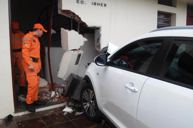 Um veículo invadiu a calçada e destruiu parte da entrada de um prédio na área central de Santa Maria após um acidente de trânsito na manhã desta quarta-feira.