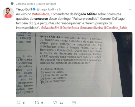 A prova do concurso da Brigada Militar do Rio Grande do Sul, que ocorreu neste domingo, está causando muita polêmica. Algumas questões foram consideradas de cunho político, ideológico e favoráveis a atual gestão do governo. Em entrevista, na manhã desta segunda-feira, ao programa Gaúcha Atualidade, da rádio Gaúcha, o comandante-geral da Brigada Militar, Andreis Dal'Lago, disse estar surpreso com o conteúdo da prova e afirmou que a instituição vai pedir a anulação de 3 a 5 questões do concurso. As questões teriam violado o princípio da impessoalidade.