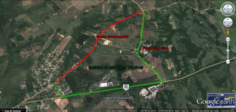 * A linha Pau a Pique no sentido Centro-Bairro irá até o bar localizado após o Frigorifico Silva e retornará pela BR-392. Após, entrará no acesso próximo ao bar Cachoeira, voltando pela Rua José Tavares ao centro (itinerário na cor verde).