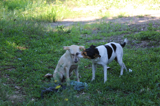 Eles foram localizados deitados na sombra de uma plantação de soja. Um dos cães tem cor caramelo, e o outro, branco, com manchas pretas.