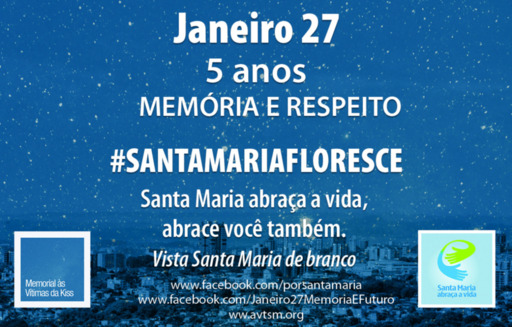 Como parte da programação de homenagens às vítimas da tragédia da Boate Kiss, que completa cinco anos em 2018, o Sindilojas e o Grupo de Trabalho Ações por Santa Maria, criado por psicólogas da cidade, realizam, mais uma vez, a campanha #SantaMariaFloresce. De acordo com a organização, o objetivo da campanha, é convidar lojistas a decorarem vitrines, fachadas e janelas de branco, em solidariedade aos familiares de vítimas e aos sobreviventes.