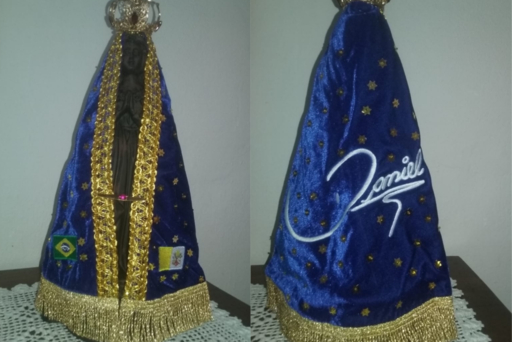 Com 45 centímetros de altura, um manto azul com detalhes em dourado e o nome de Daniel bordado, a nova Nossa Senhora ficará na tenda da vigília todas as quartas -feiras e nos dias 27 de cada mês. A ideia é abrigá-la em uma capelinha, protegida com vidro.
