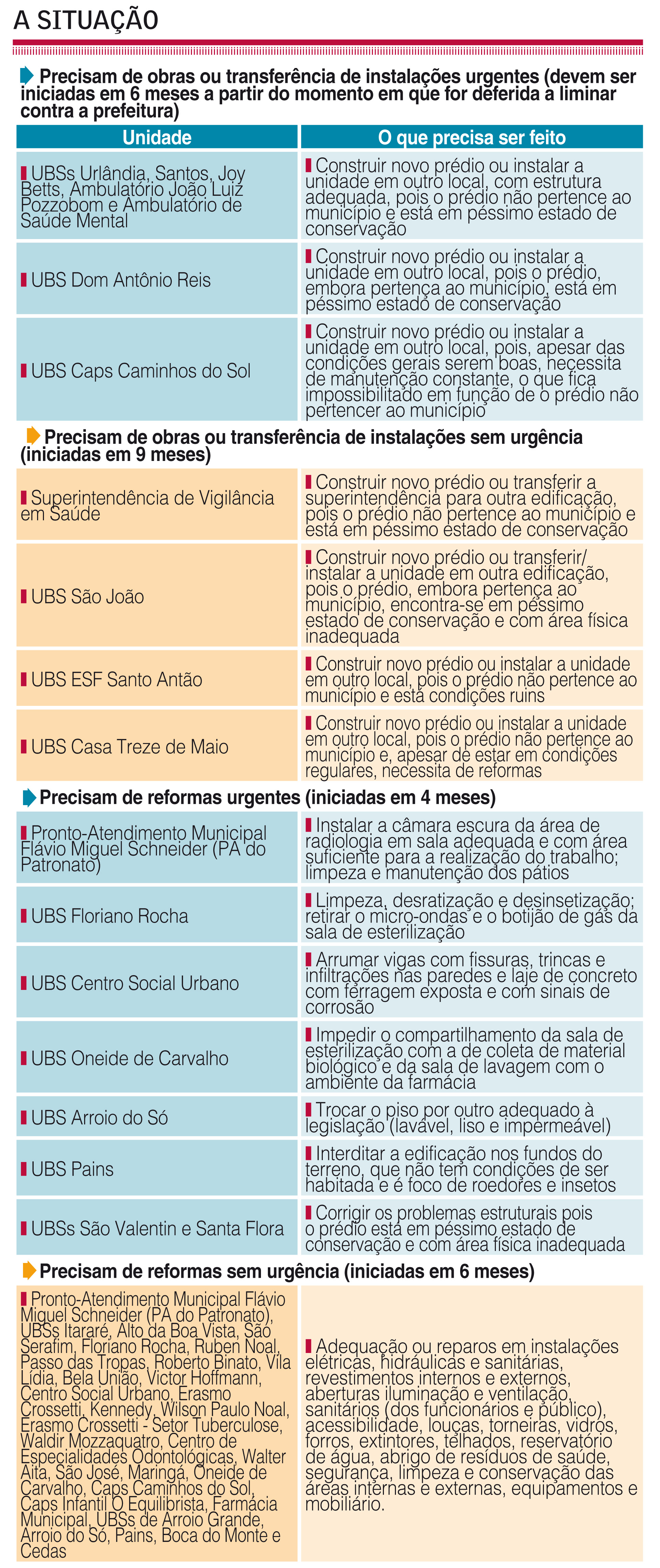 O Diário teve acesso à lista das 44 unidades de saúde avaliadas pela Vigilância Sanitária e que são objeto de uma ação civil pública promovida pela Promotoria de Justiça Cível e Cidadania contra a prefeitura. A ideia, conforme o Ministério Público (MP), é obrigar o município a reformar ou mesmo trocar de lugar os postos que funcionam em locais precários. Conforme o levantamento, o Centro de Atenção Psicossocial (Caps) Prado Veppo é o que apresenta as melhores condições.