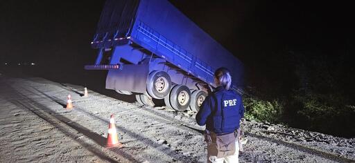 Uma carreta, com placas de São Borja, saiu da pista no km 312 da BR-287, entre Santa Maria e São Vicente do Sul. O fato ocorreu por volta das 00h20min desta terça-feira (24), próximo ao desvio da ponte da várzea do Rio Toropi.