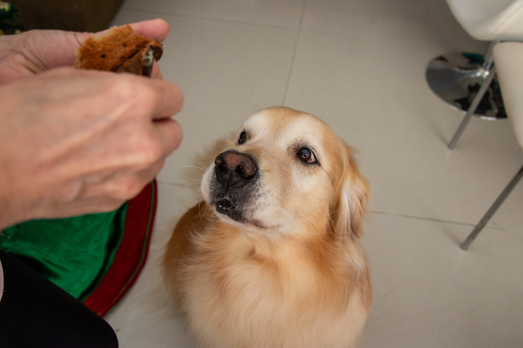 Mel, a golden retriever que inspirou o negócio, acompanha atentamente a rotina de produção da ceia natalina.Foto: Vinicius Becker (Diário)
