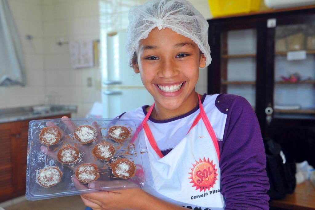 Na manhã de quinta-feira, Indiara Teixeira (foto acima), 12 anos, divertia-se na segunda aula de culinária. Ela e mais cinco colegas estavam fazendo bombons.