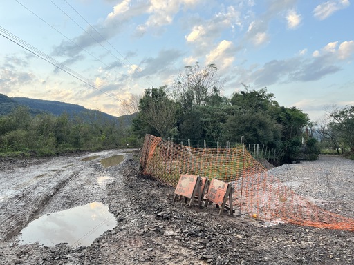 Na Estrada Municipal Ângelo Berleze, que dá acesso ao distrito de Arroio Grande, em Santa Maria, a reconstrução após as enchentes precisou ser interrompida. Com o retorno da chuva, parte do conserto da rua e da ponte foi levado pela água. Assim, moradores ainda não tem perspectiva de ter um dos principais acessos de volta. A alternativa está sendo a passagem por um desvio construído e custeado por quem reside no local.