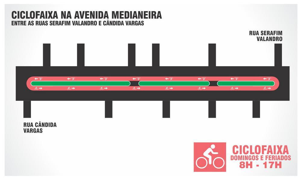 A prefeitura estava pintando na segunda-feira a ciclofaixa de dois quilômetros de extensão na Avenida Medianeira. O espaço será destinado a passeios de bicicleta só aos domingos e feriados, das 8h às 17h. Ela deve ser estreada no próximo domingo, quando será entregue à comunidade.