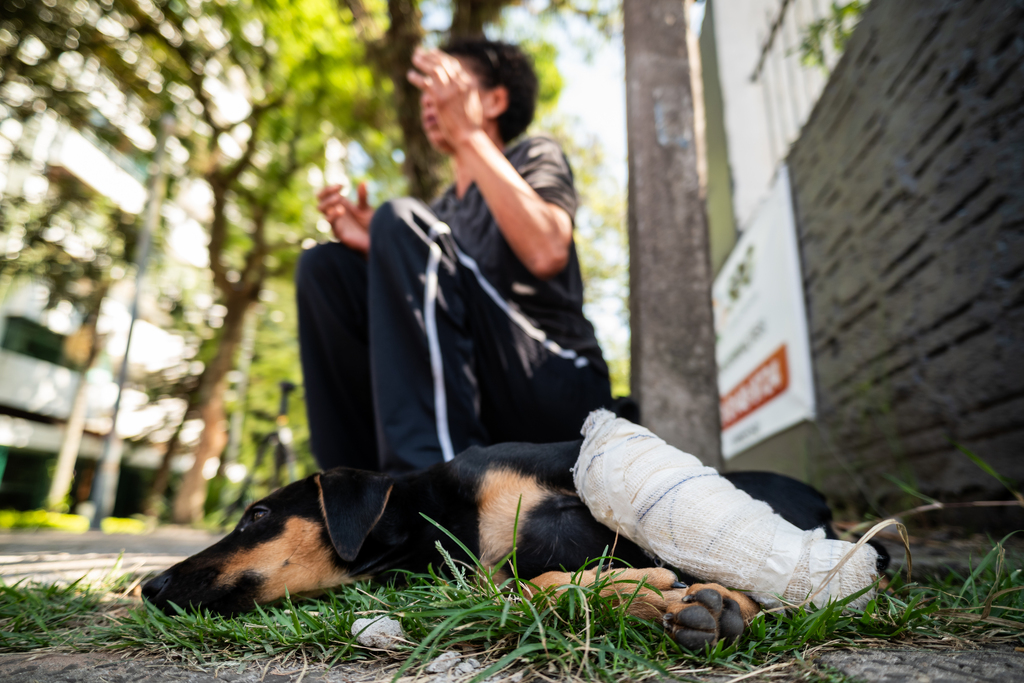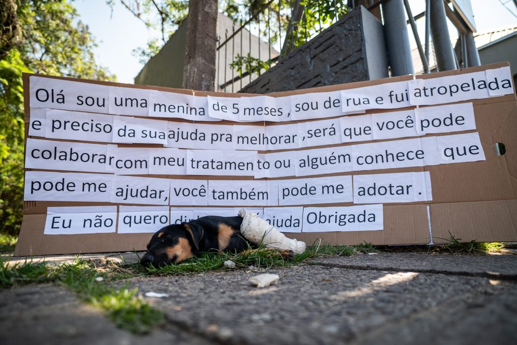 Desde então, Lisiane passou a cuidar da cachorrinha como pôde. Sem condições financeiras, buscou alternativas para aliviar a dor do animal e tentou atendimento em clínicas veterinárias, mas não conseguiu auxílio. Foi aí que ela teve a ideia de improvisar um cartaz e se posicionar na avenida, na tentativa de encontrar alguém que pudesse adotar a cachorrinha, que recebeu o nome de Atena.